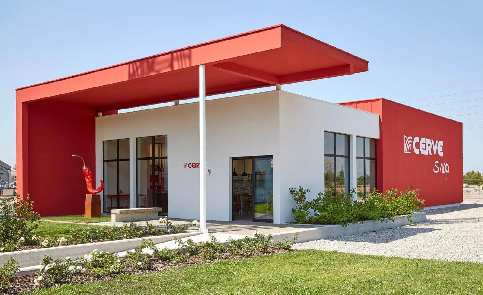 The building is composed of two internal spaces: one used as a warehouse and one for sales to the public. The warehouse is completely enclosed, while the shop opens towards the outside to give visibility to the products being sold. In terms of orientation, the building is closed to the west to avoid the low and hot summer afternoon sun rays and opened to the east to welcome the fresh morning light. To the south, a high and deep portico provides the necessary shade to avoid solar radiation during the central hours. To the north is the warehouse with reduced glass surfaces to meet storage needs.